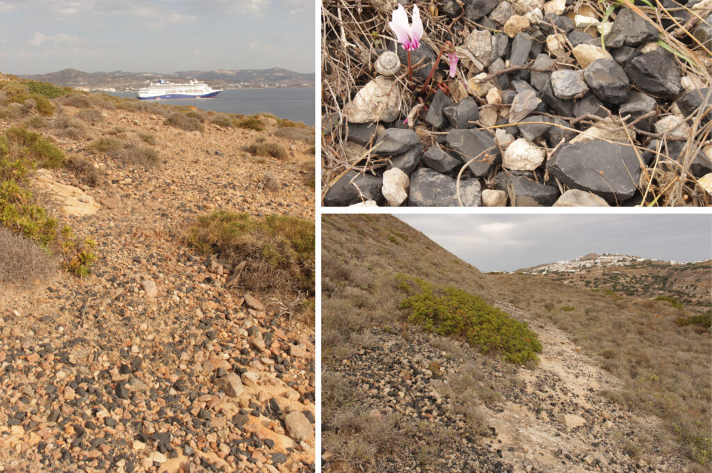1. kép ▪ Mílosz szigetének egyik obszidián lelőhelyén, a Míloszi-öböl északi partja mentén emelkedő Nychia hegyen a felszínen az őskorban is nagy mennyiségben voltak találhatók eszközkészítésre alkalmas méretű obszidián gumók. A páratlan geológiai és közlekedésföldrajzi adottságok miatt a hegy az Égei-tenger tágabb környékének legnépszerűbb obszidián lelőhelye volt mintegy 10 000 éven keresztül.