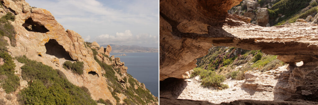 4. kép ▪ Mílosz szigetén, a Demenaghaki hegy oldalán az őskorban mesterséges üregek mélyítésével érték el, s termelték ki teljesen a jó minőségű obszidiánt tartalmazó kőzetrétegeket, s hagytak hátra a hegyoldalban kisebb-nagyobb méretű, felszínről nyíló üregeket. Jelen tudásunk szerint kontinensünkön kizárólag itt ismertek az obszidián felszín alatti bányászatára utaló nyomok.