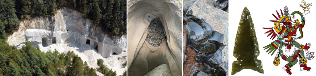 Hidalgo szövetségi állam területén, a Keleti-Sierra Madre hegységhez tartozó, a Sierra de las Navajas hegyvonulat részét képező Cerro de las Navajas (a beszédes név jelentése: „Pengék hegye”) vulkáni komplexum területén az obszidián kitermelése részben felszínről lefelé mélyített üregekből, részben mélyművelésű bányákból történt. A térségben a felső pliocén korban több ciklusban is zajlott riolitos jellegű vulkáni tevékenység. Ekkor jöttek létre azok a változatos színű – a fekete mellett zöld, sőt helyenként „aranyfényű” – obszidiánok, amelyek vastag pumisz és riolit kőzettestekbe ágyazódva, felszín alatt fordulnak elő. A különböző közép-mexikói kultúrák népei – Teotihuacan városállam felemelkedésétől kezdődően (kb. Kr. e. 150-től) több mint másfél évezreden keresztül termelték „az Istenek ajándékát”. Kezdetben, a sötétszürke színváltozatot fejtették („Otumba obszidián forrás”), később a zöld színű obszidiánt („Pachuca obszidián forrás”): utóbbi színváltozat mind a tolték, mind az azték civilizáció időszakában a legkeresettebb volt. Összességében a több mint 500 mélyművelésű bányajáratból kitermelt mennyiség számítások szerint mintegy 5000 tonna volt. A legnagyobb aknák 50-70 méteres mélységet értek el.